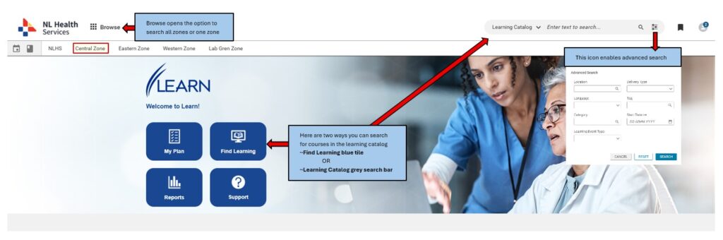 Here you can narrow the search for courses by zone if you click on this browse button. You can search learning in two ways.